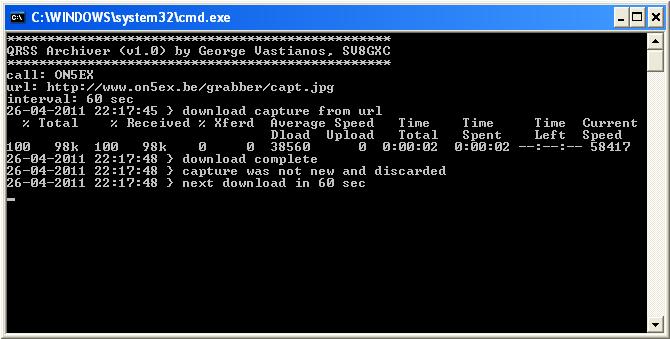 The "QRSS Archiver" is a tiny command line application that I have developed in order to solve the problem of the manual online grabber check and covert it to an automatic archiving process. The "QRSS Archiver" accepts as command line parameters: a) the callsign of the online grabber, b) the URL of the FFT image and c) a checking interval in seconds.